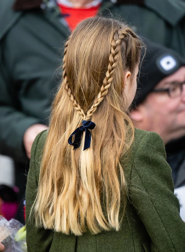 The chic young royal paired with her mother, wearing a neatly tied French braid in the front section of their hair, and accessorised her Rapunzel-esque hair half up and half down.